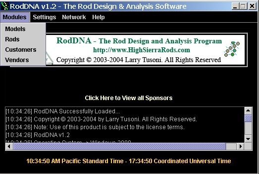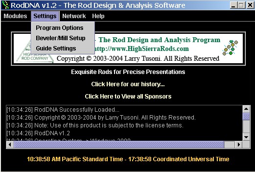 RodDNA’s main dialog provides access to the settings and Modules. It also displays rotating sponsor banners (with associated website links), descriptions and optional sponsor promotions with associated links. Program session information is indicated in a scrolled window, and the current time is displayed in local and UTC (Universal Coordinated Time - formerly called GMT). Note that the UTC time may be useful for determining when an international Rodmaker may be on-line, etc.