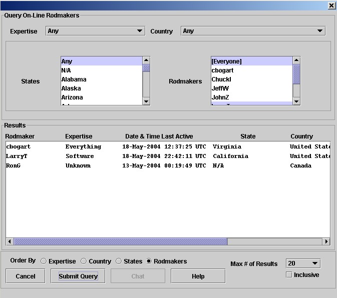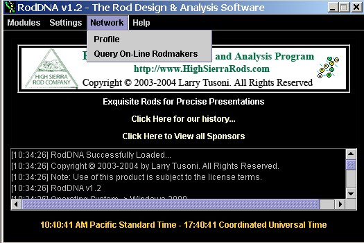 When RodDNA is connected to the Internet (and the Servers), Rodmakers can search to see who is on-line and potentially communicate with them; register or update registration information such as email address, Rodmakers with whom you want to share files with, etc.; save and load data to and from the network; and retrieve updated sponsor information and master Model and Vendor updates.
