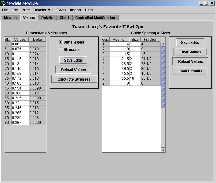 You have two options for entering or editing a Model's taper dimensions. You can use the Values Tab to enter or edit each taper directly, or you can use the Model Taper Dimensions dialog.  You access this dialog by clicking on the Dimensions field for a selected model. You may have to scroll the Model's dialog to the right to locate the Dimensions field, which is to the right of the Notes field.