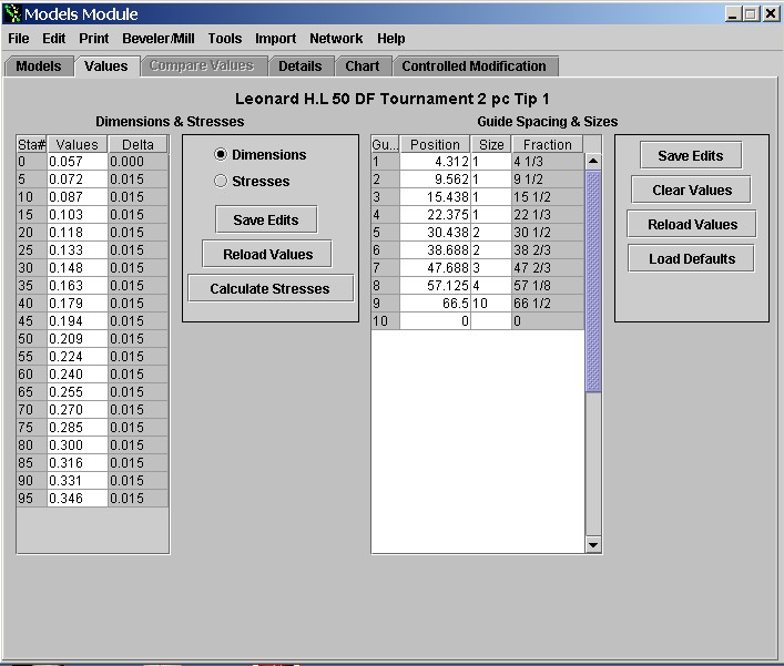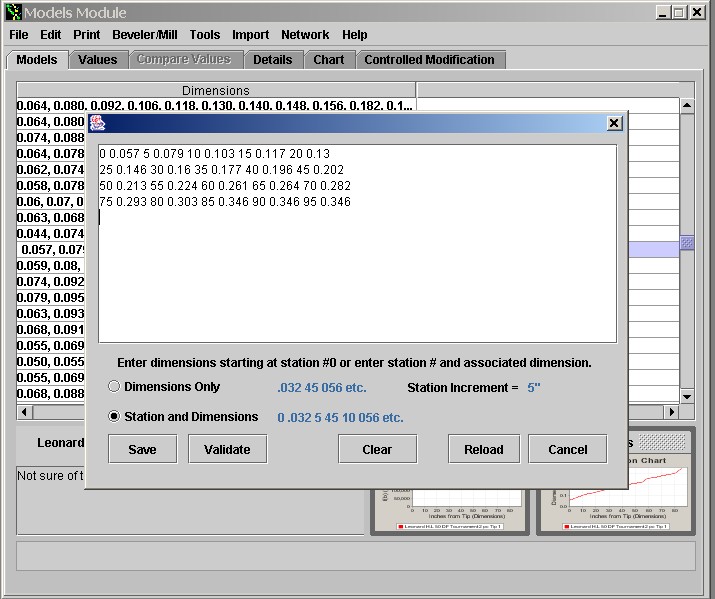 Here is an example:  I have entered the first station # of 0 followed by the tip dimension 57 (.057) followed by the last station # of 95 with it's dimension of 346 (.346).